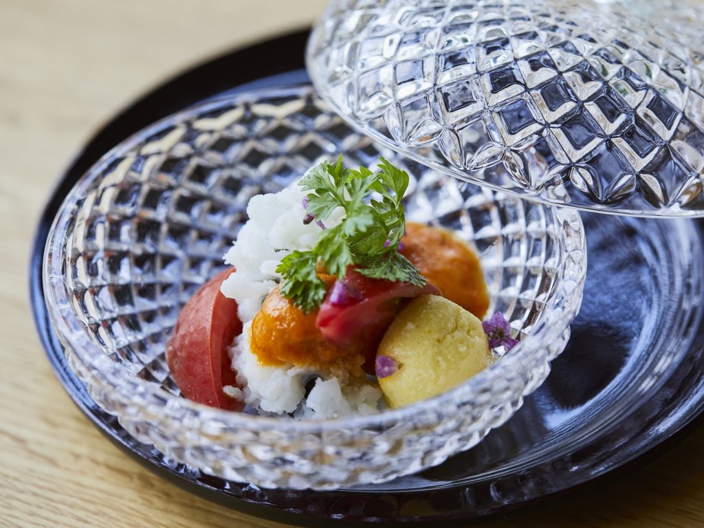 鱧、雲丹、トマトなどの食材を使った前菜です。さっぱりとお召し上がりいただけます。