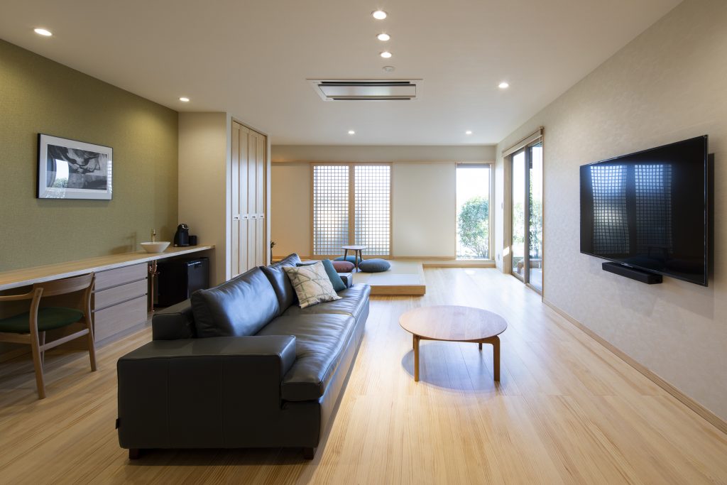 スタイリッシュで広々とした室内には木の香りで満ち、落ち着いて寛いで頂けます。