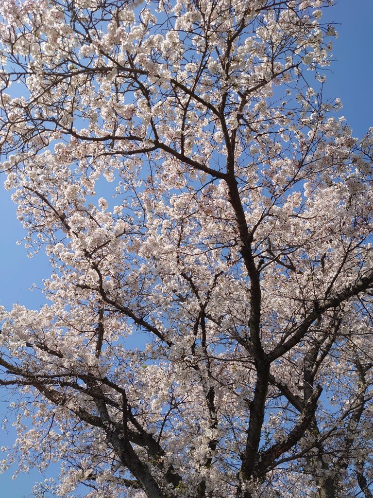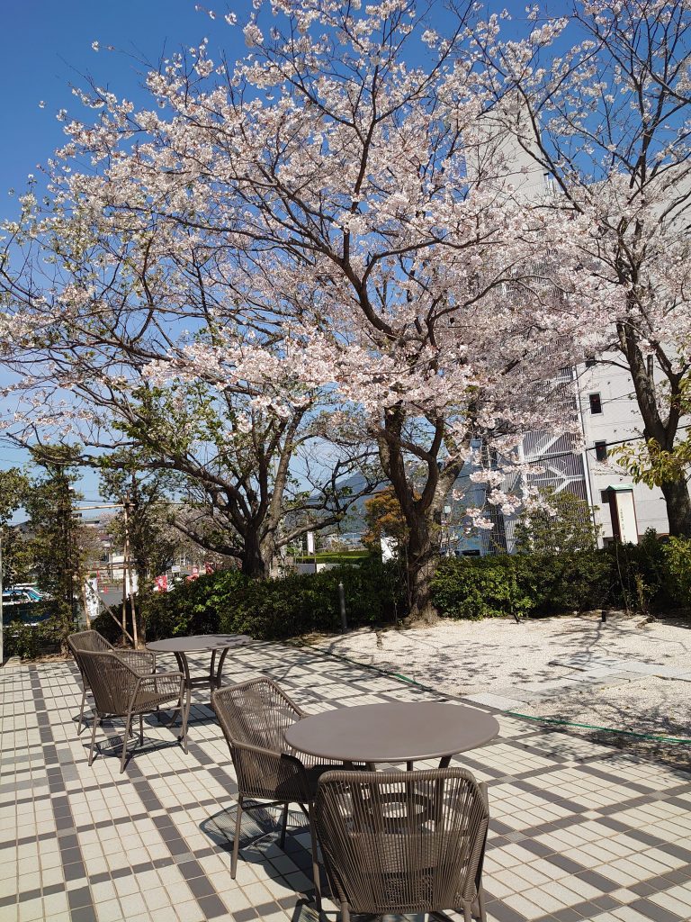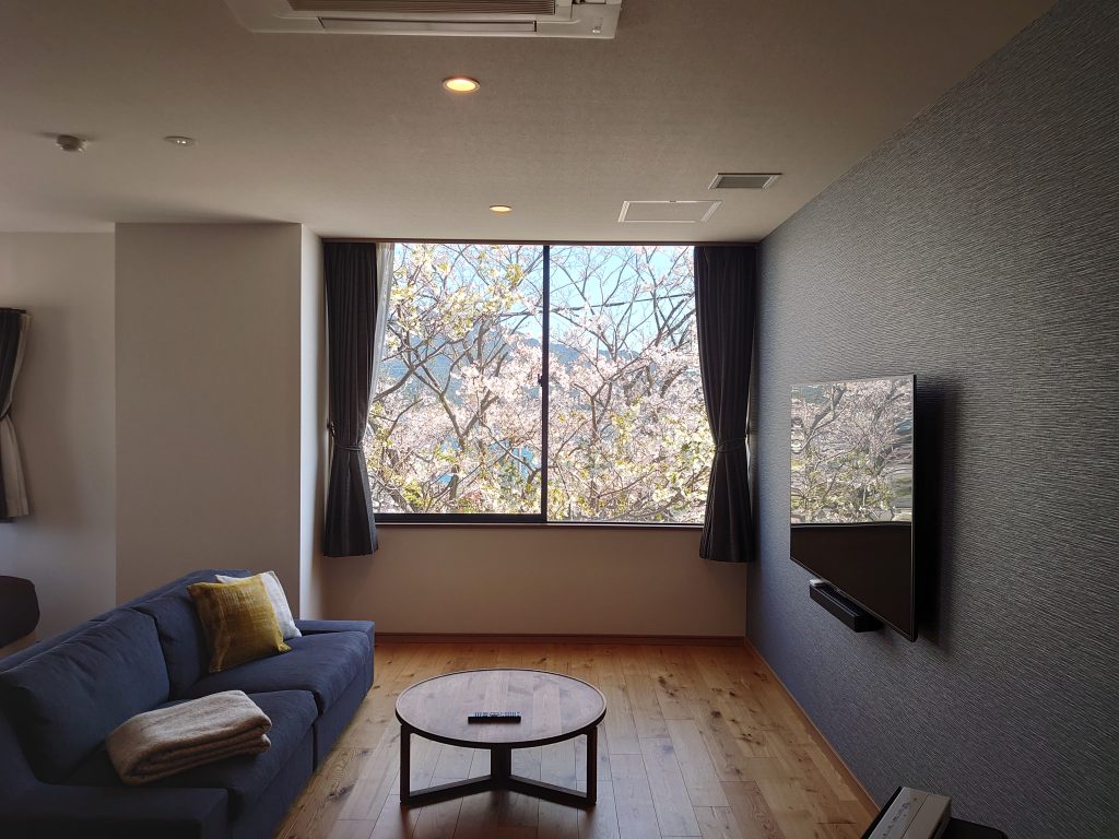 桜が目の前のお部屋で、桜の奥には海が見えます。