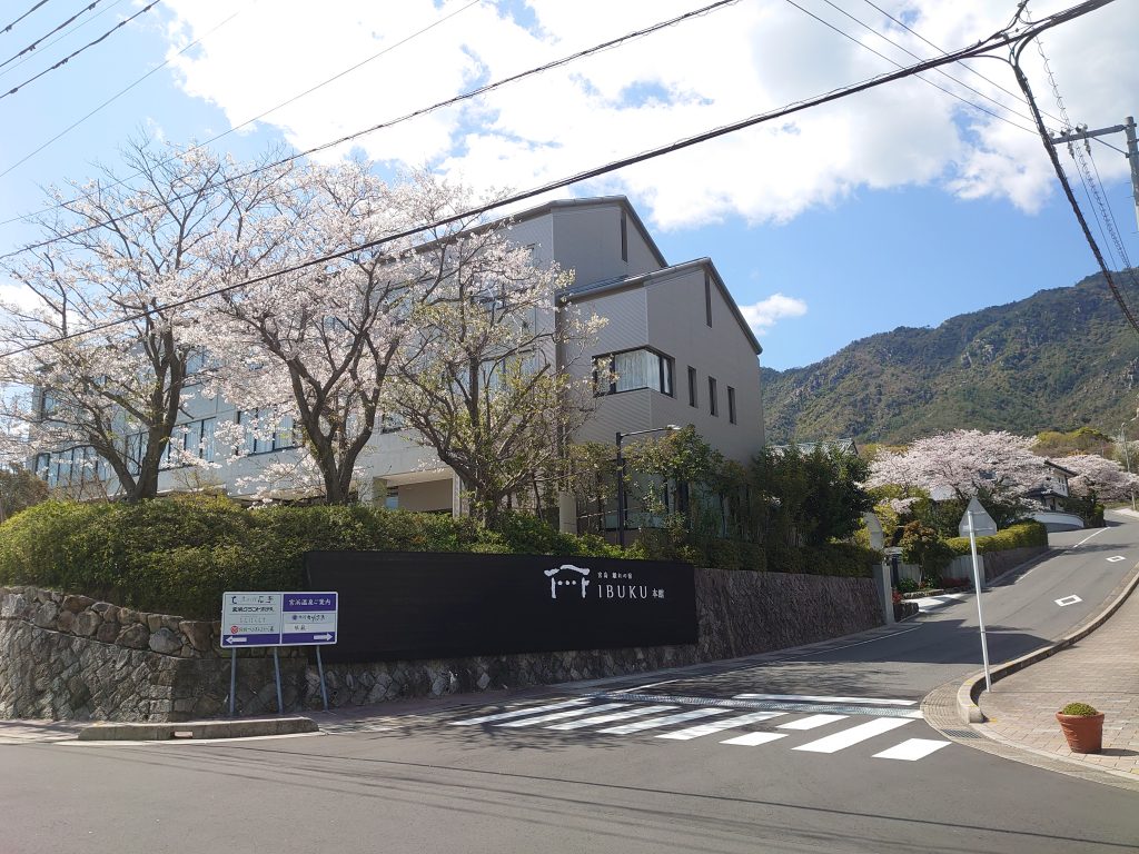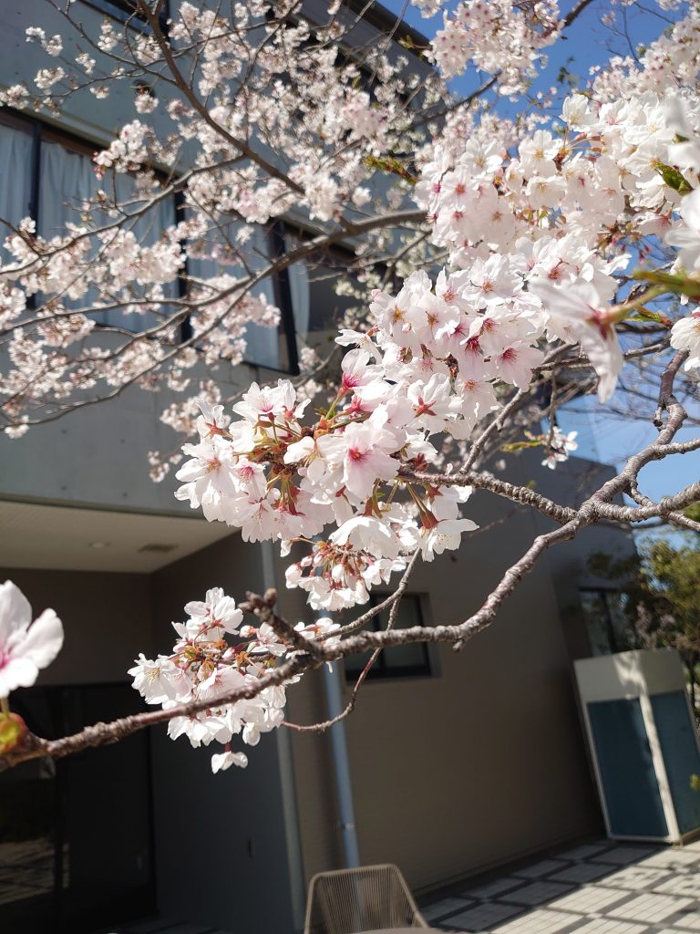 桜が目の前のお部屋で、桜の奥には海が見えます。