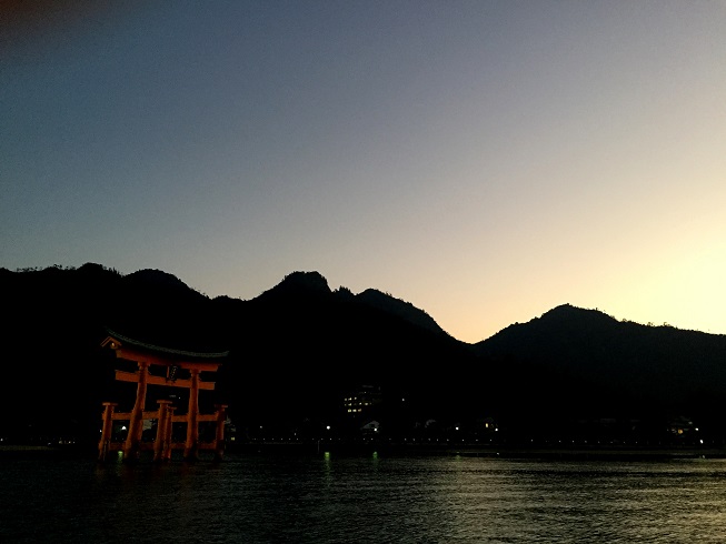 見る角度によっては、大鳥居のライトアップが後光のように輝いて、