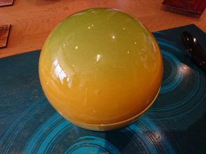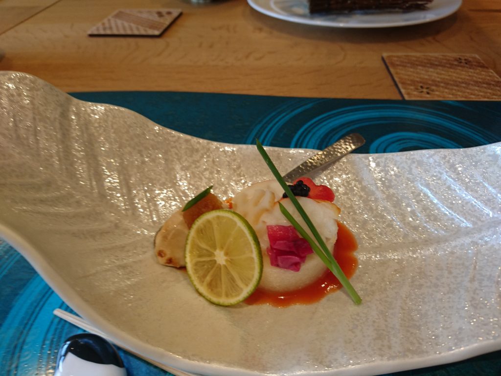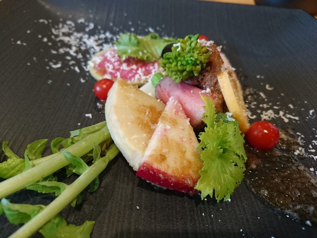 蕪を炊いたものでムースにしており、金時人参のソースを下に敷き、色鮮やかな逸品に仕上がっております。