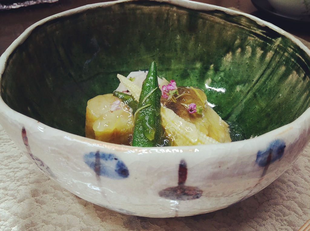 「鮎沢煮、廿日市茄子翡翠煮、丸子芋、陸蓮根を広島レモンジュレで」